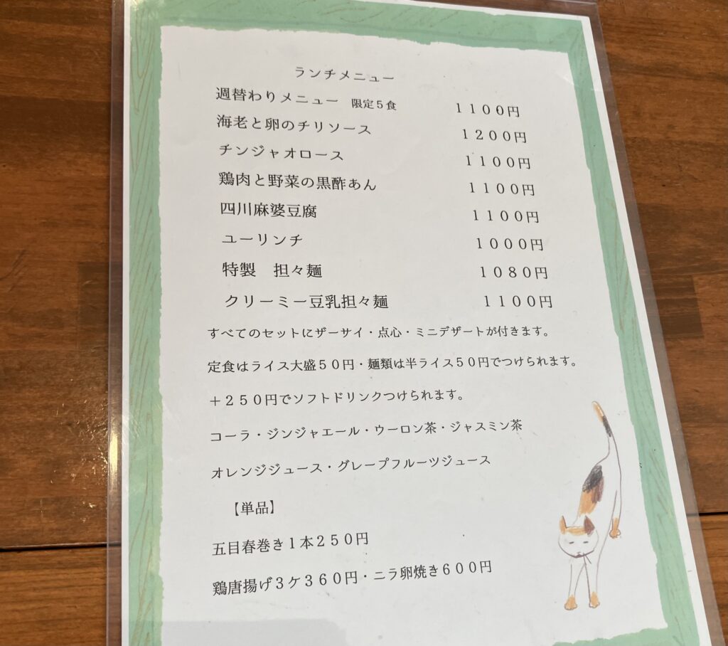 店内で見たメニューはこんな感じで、シンプルですが見やすくてなにより可愛かったです。全てのメニューにザーサイと点心、ミニデザートが付くなんてとてもお得だと思いました。