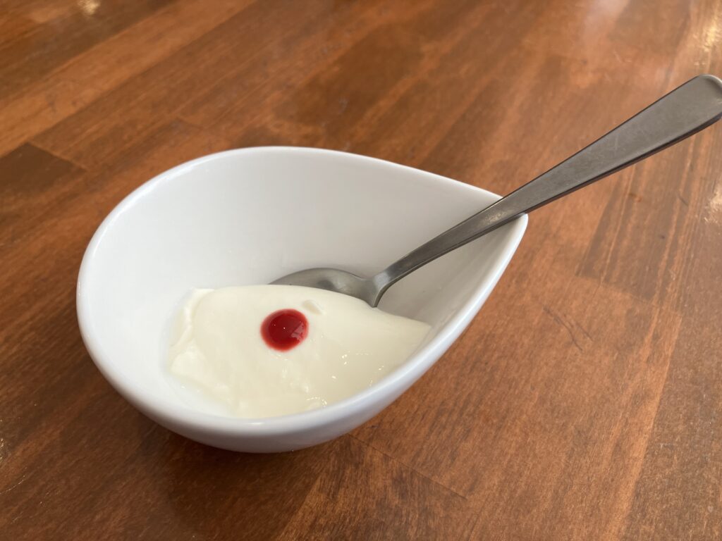 杏仁豆腐は冷えていて、上に一滴ほど乗っている赤いソースが良いアクセントになっていました。少量でも食後のデサートとして、満足感が高かったです。